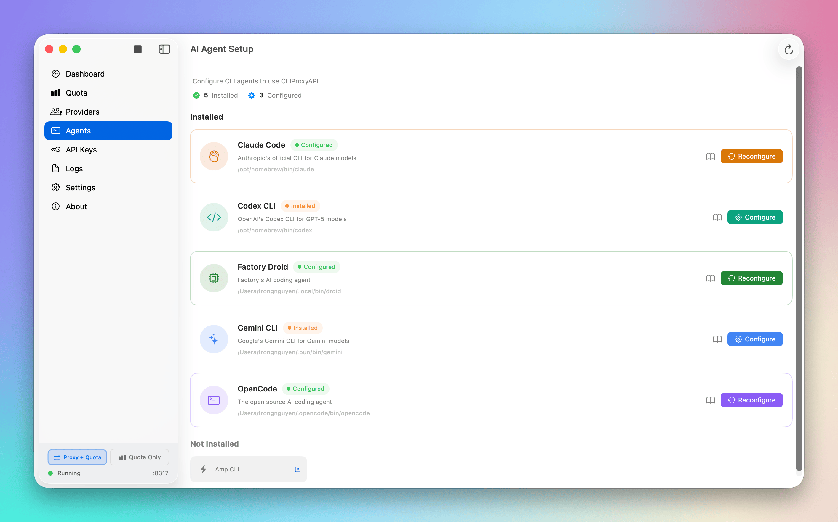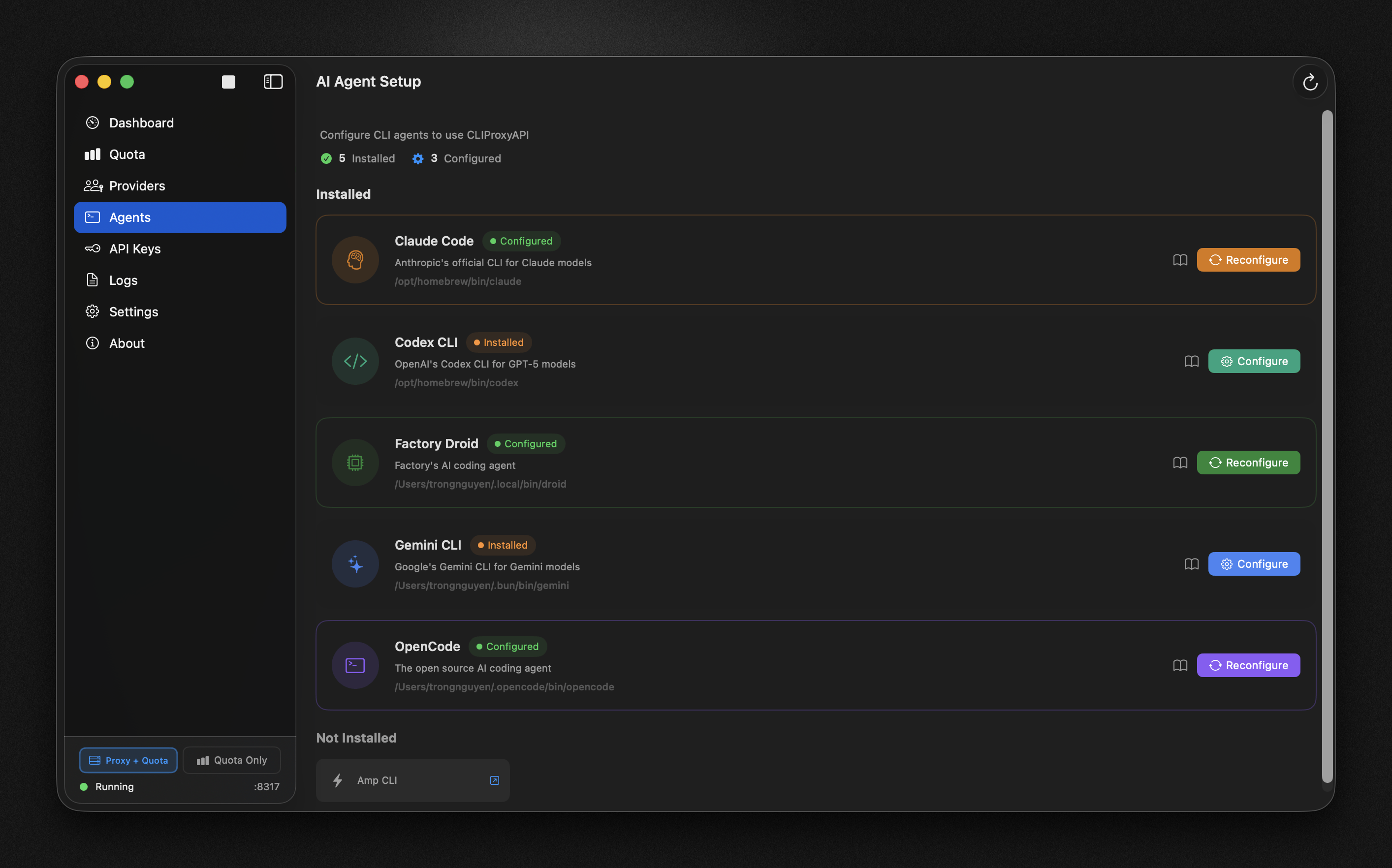 Agents in Quotio refer to CLI tools that integrate with AI providers. These are the command-line applications you use for AI-powered coding tasks.