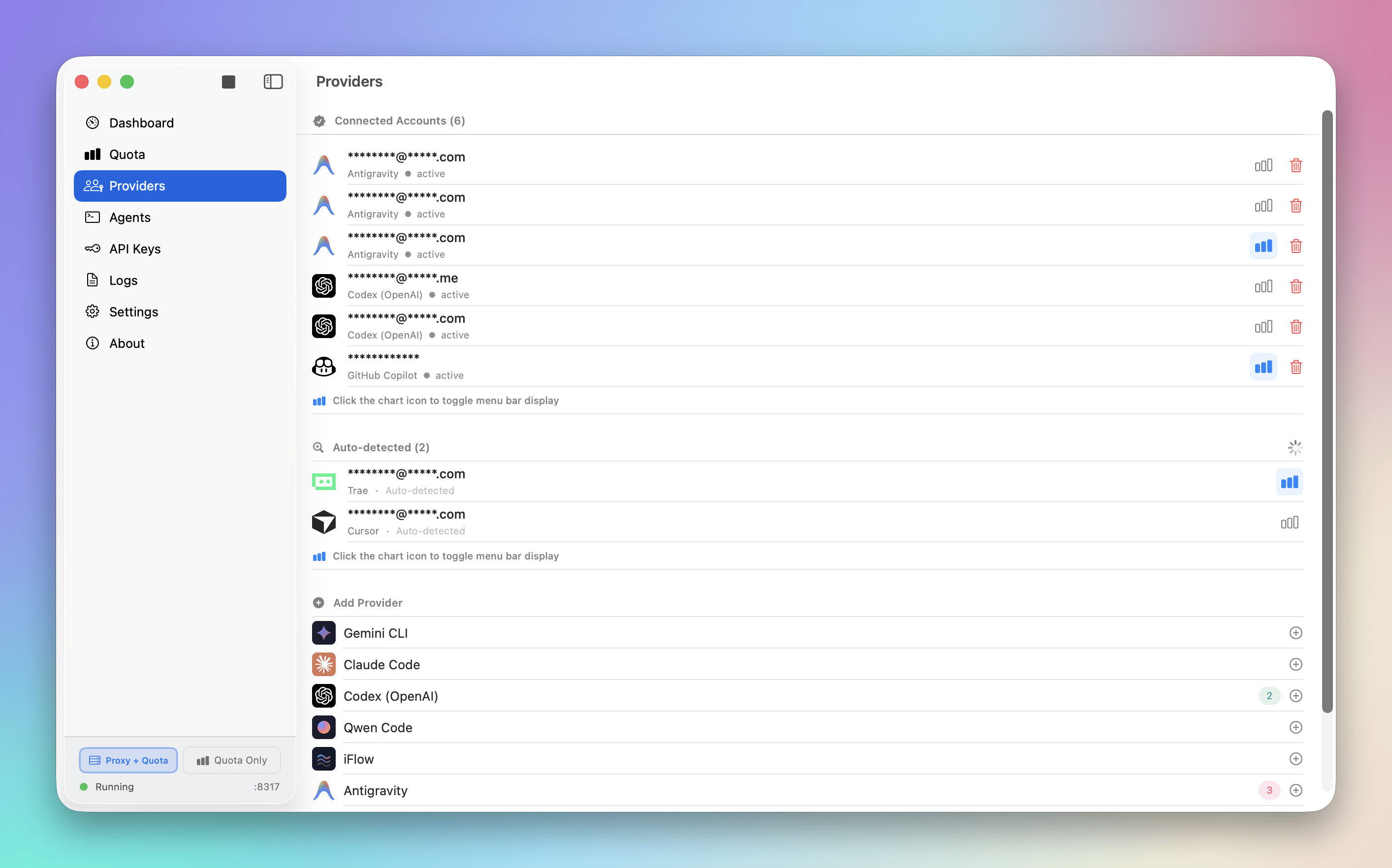 Quotio supports different types of provider connections, each with its own authentication method and use cases: