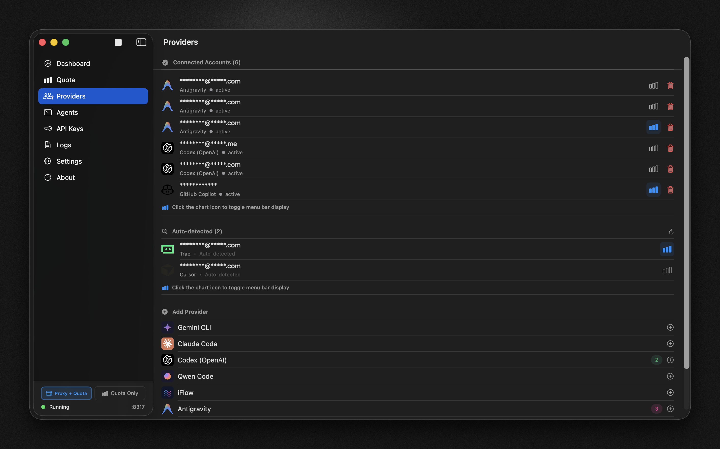 Note: These are not full providers and cannot route AI requests. They only provide quota monitoring.